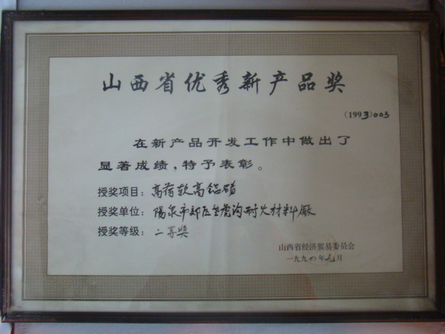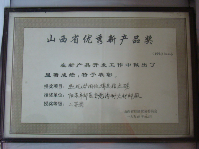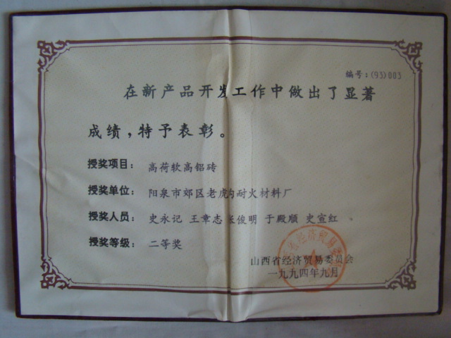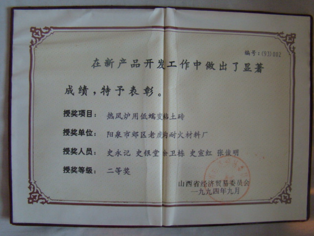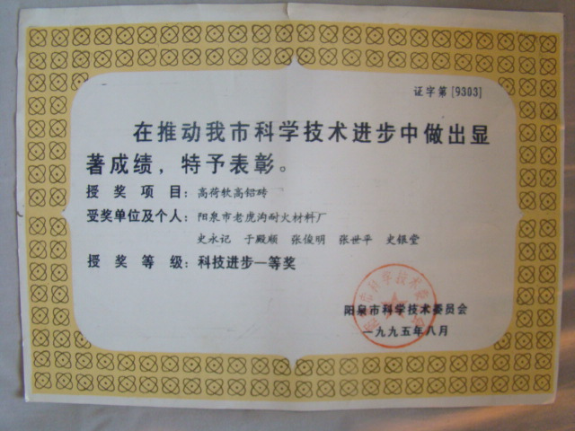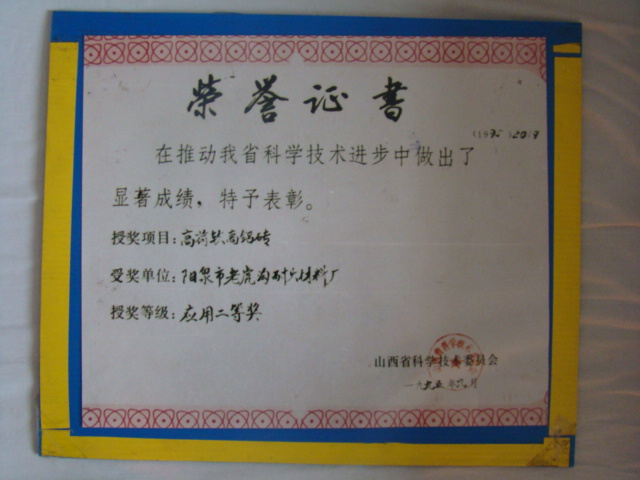 熱風(fēng)爐用低蠕變高鋁磚、高荷軟高鋁磚獲省科技進(jìn)步二等獎(jiǎng),微膨脹高鋁磚列入火炬計(jì)劃項(xiàng)目,炭素焙燒爐用特種高鋁磚已批準(zhǔn)國(guó)家專(zhuān)利